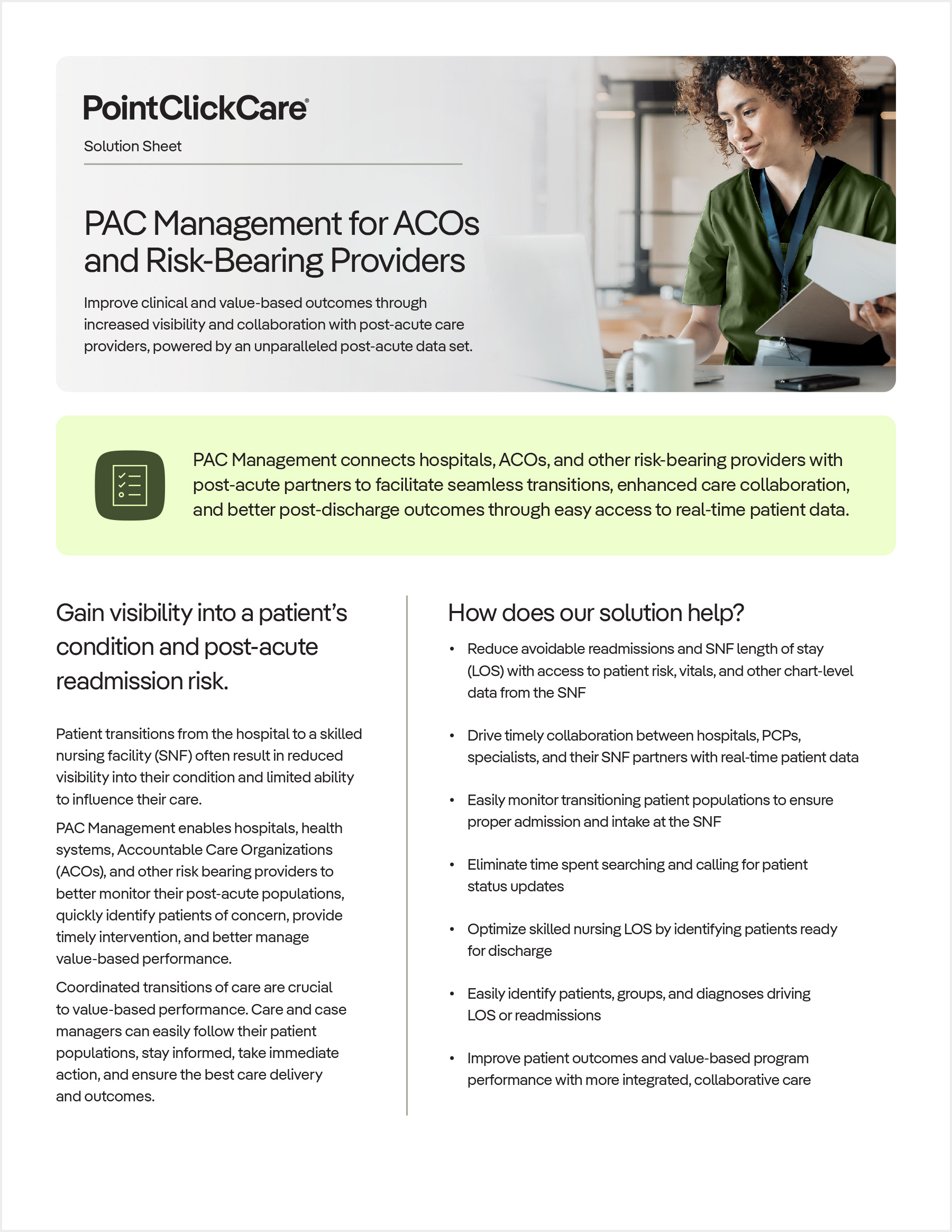 PAC Management connects Accountable Care Organizations and Risk-Bearing Providers with post-acute partners to facilitate seamless transitions, enhanced care collaboration, and better post-discharge outcomes through easy access to real-time patient data.