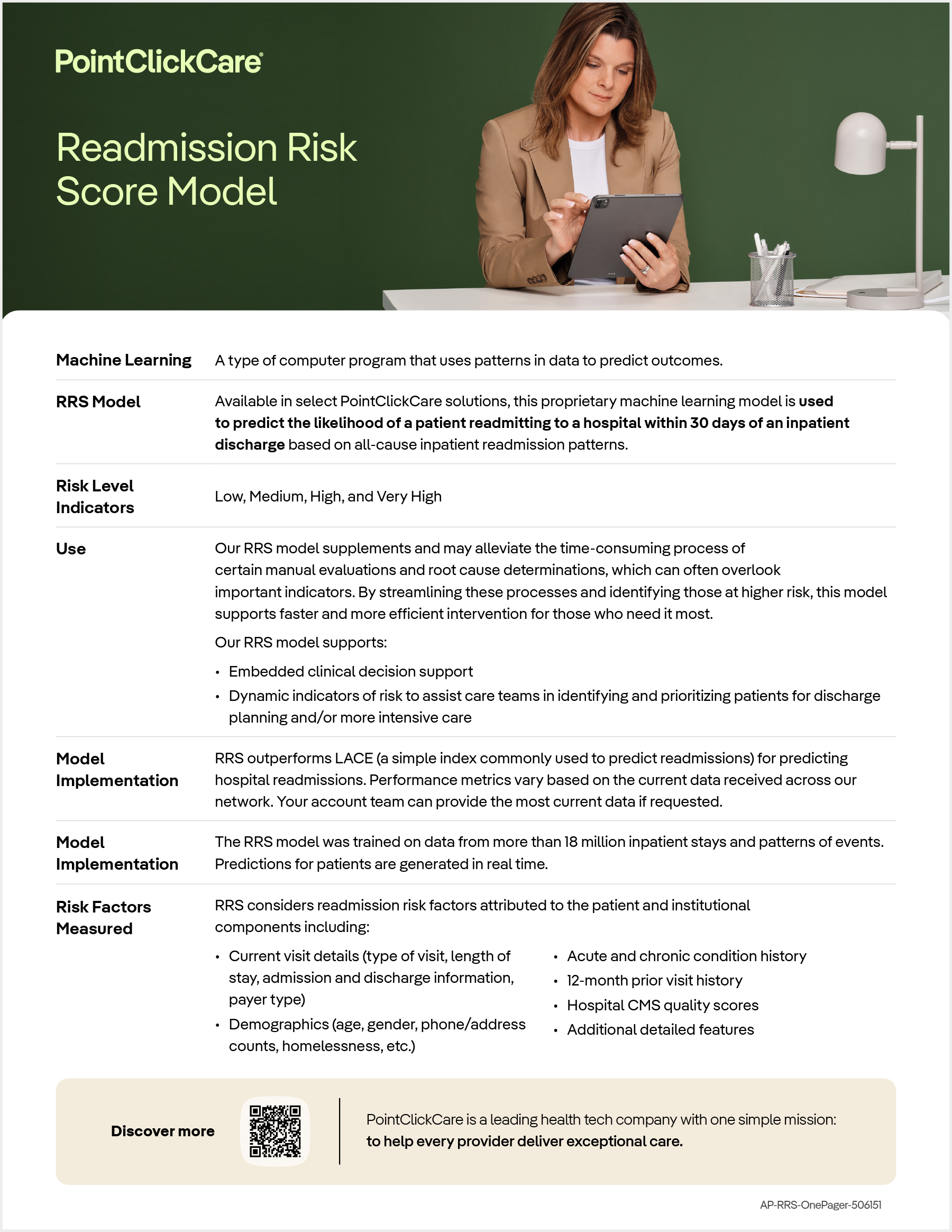 Our exclusive Readmission Risk Score (RRS) model supports our care collaboration tools by delivering insights on the likelihood of hospital readmission for any cause, enabling prioritization of high-risk patients for timely medical intervention.