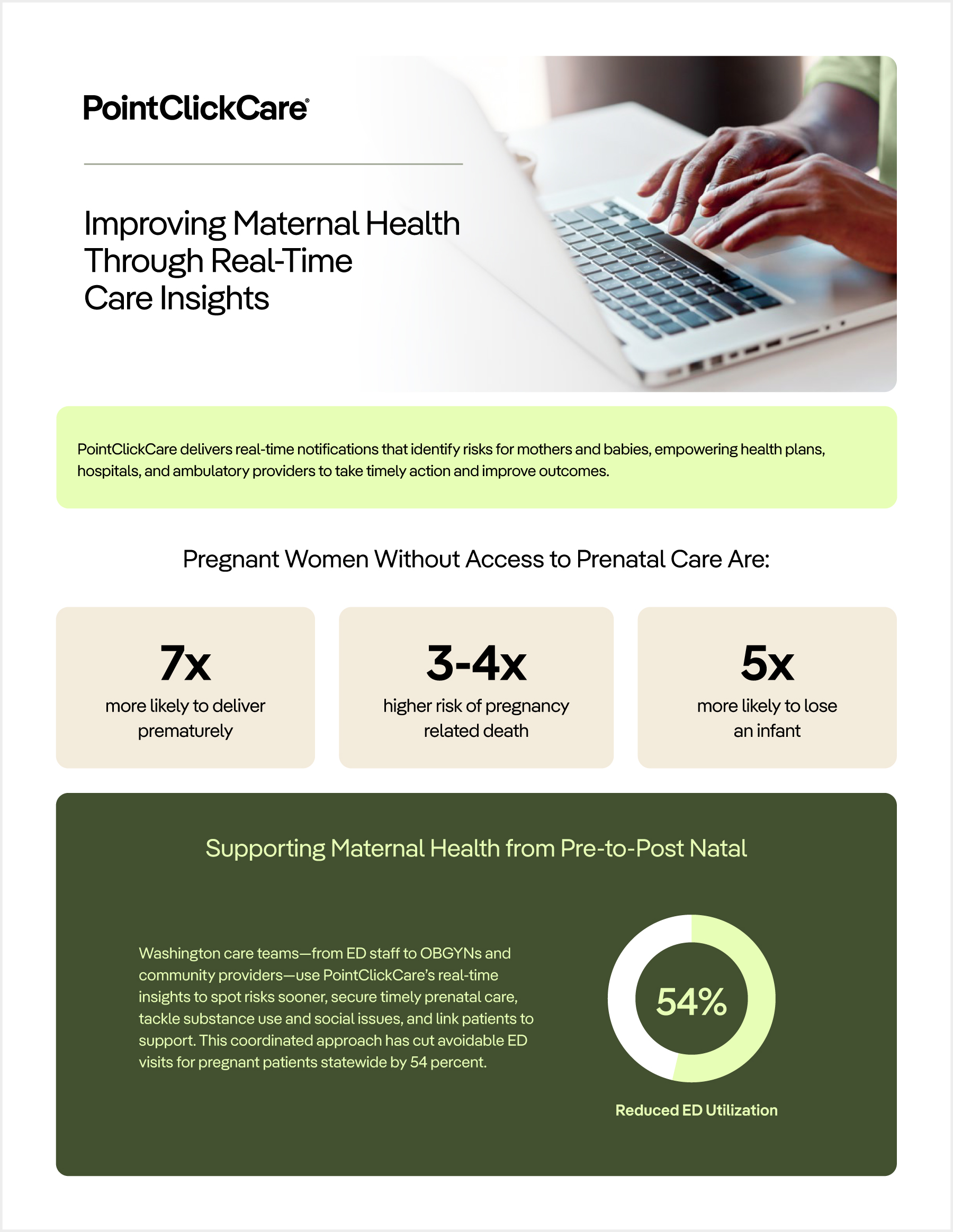 Explore how PointClickCare supports maternal health from pre-to-post natal care with real-time notifications that identify risks for mothers and babies. Learn how enabling a coordinated approach empowers health plans, hospitals, and ambulatory providers to take timely action and improve outcomes.