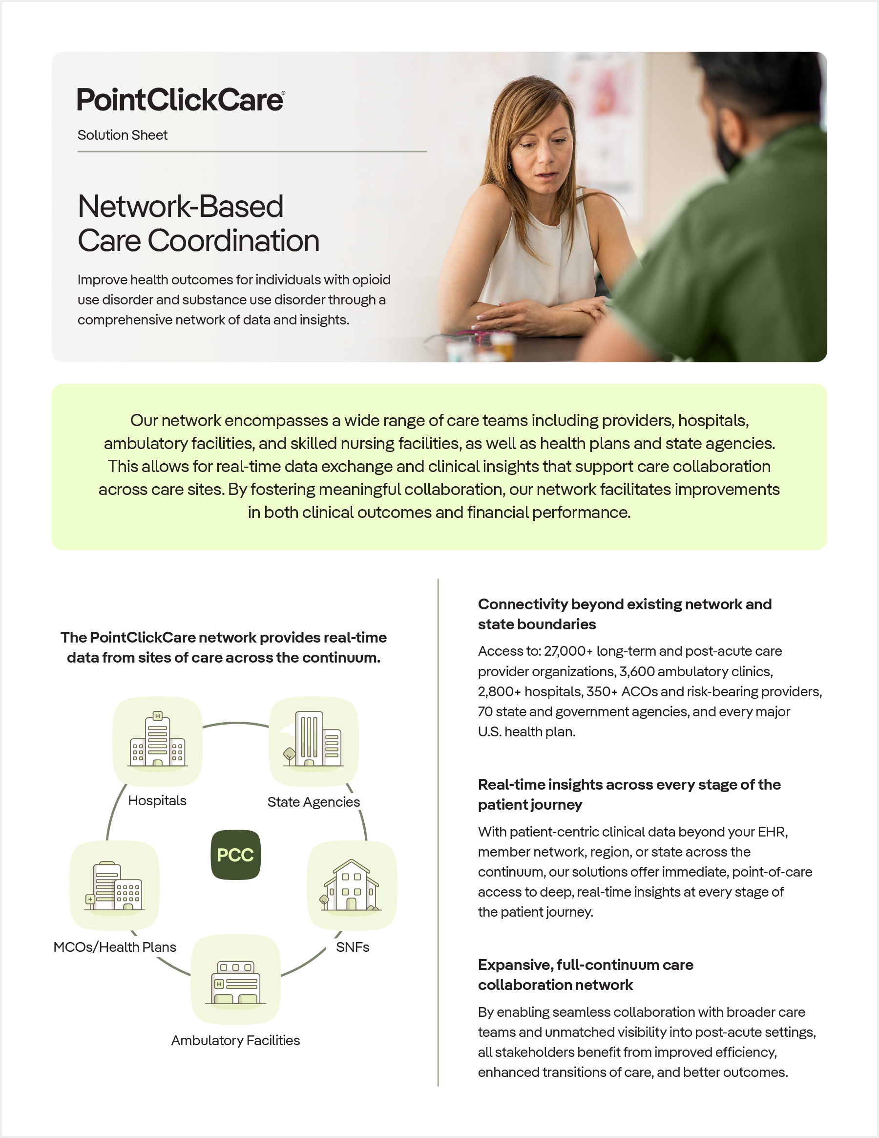 With access to PointClickCare’s network and solutions, providers and care coordinators managing Medicaid and statewide patient populations can reduce costs, advance care quality, and drive improvement initiatives, particularly for high-touch populations living with chronic conditions such as OUD and SUD.