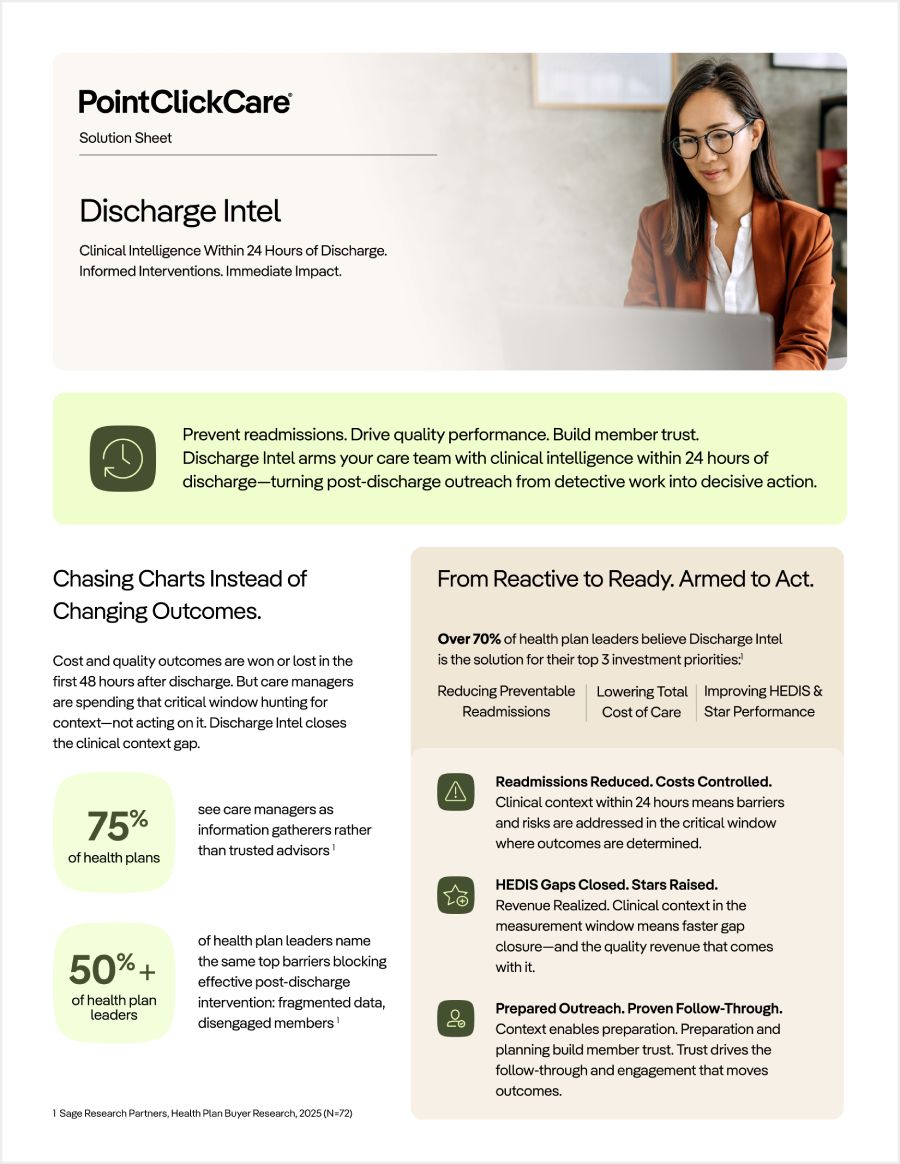 Prevent readmissions. Drive quality performance. Build member trust. Discharge Intel arms your care team with clinical intelligence within 24 hours of discharge—turning post-discharge outreach from detective work into decisive action.