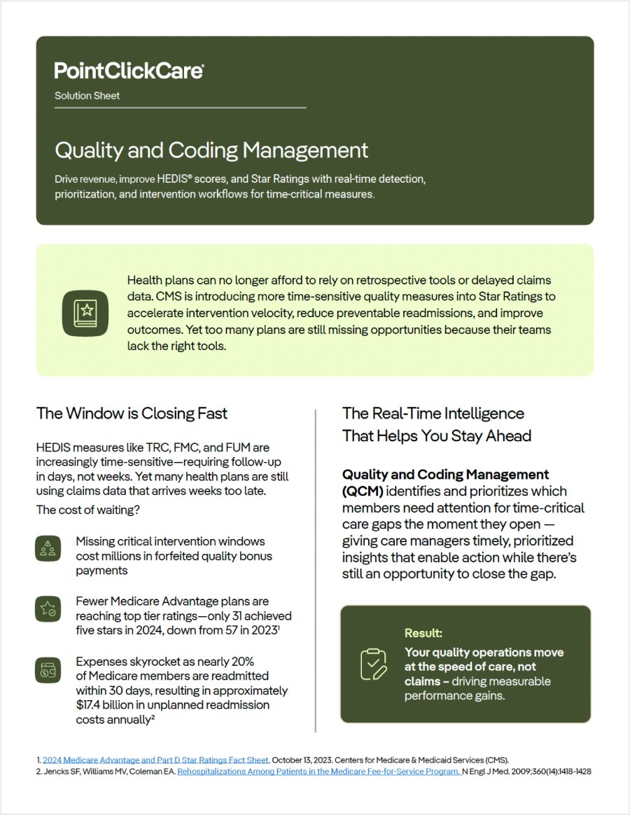 Time-sensitive quality measures demand real-time action. Discover how PointClickCare helps health plans close care gaps faster, prioritize high-impact interventions, and drive measurable quality performance.
