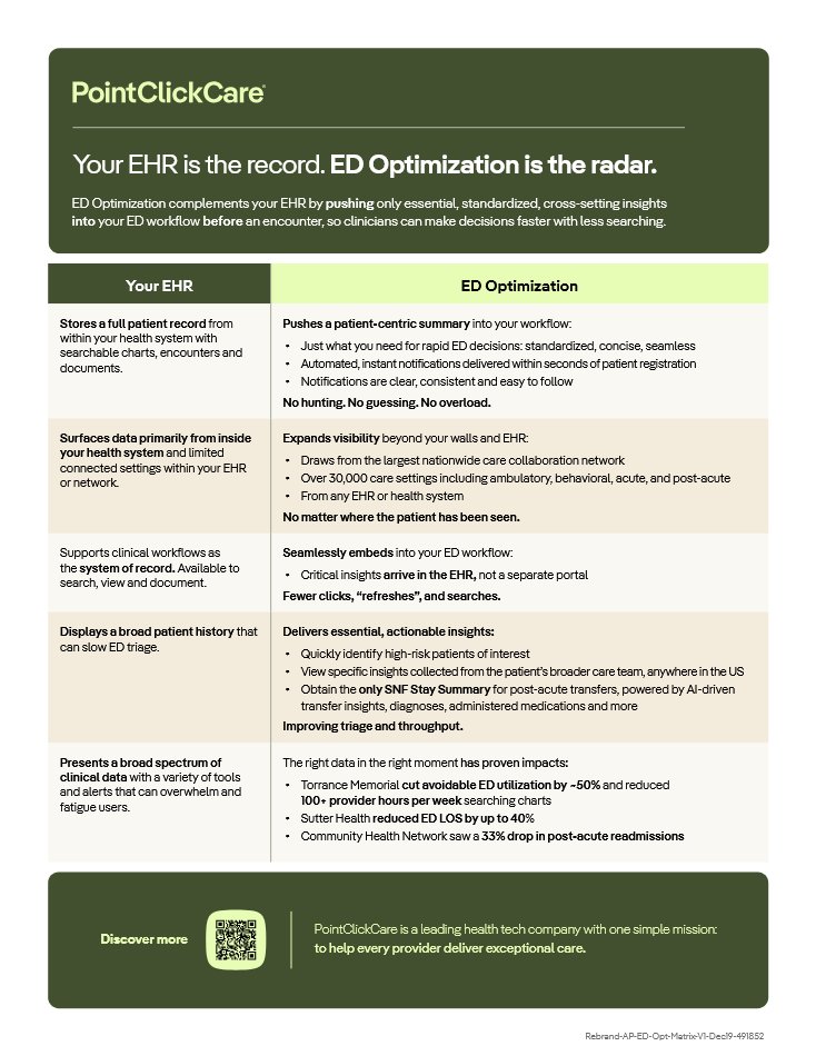 Explore this valuable comparison of your EHR’s current capabilities vs. your EHR plus ED Optimization. Learn how ED Optimization seamlessly and instantly pushes essential insights into your ED workflow before an encounter begins. See how the right data in the right moment has proven impacts.