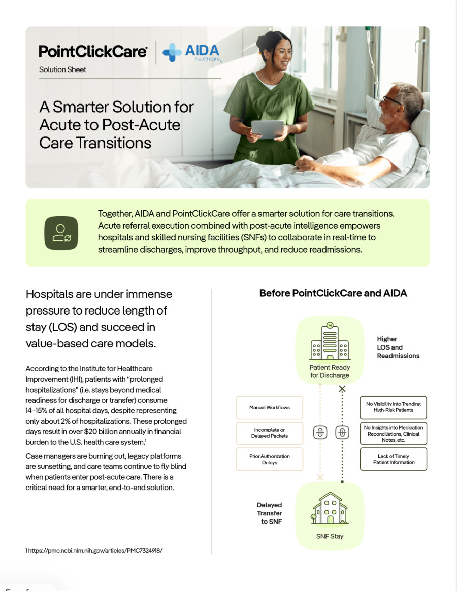Discover PointClickCare and AIDA’s smarter, end-to-end solution for care transitions and fix the broken handoff between hospitals and skilled nursing facilities (SNFs). Explore how acute referral execution combined with post-acute intelligence helps to streamline discharges, improve throughput, and reduce readmissions.