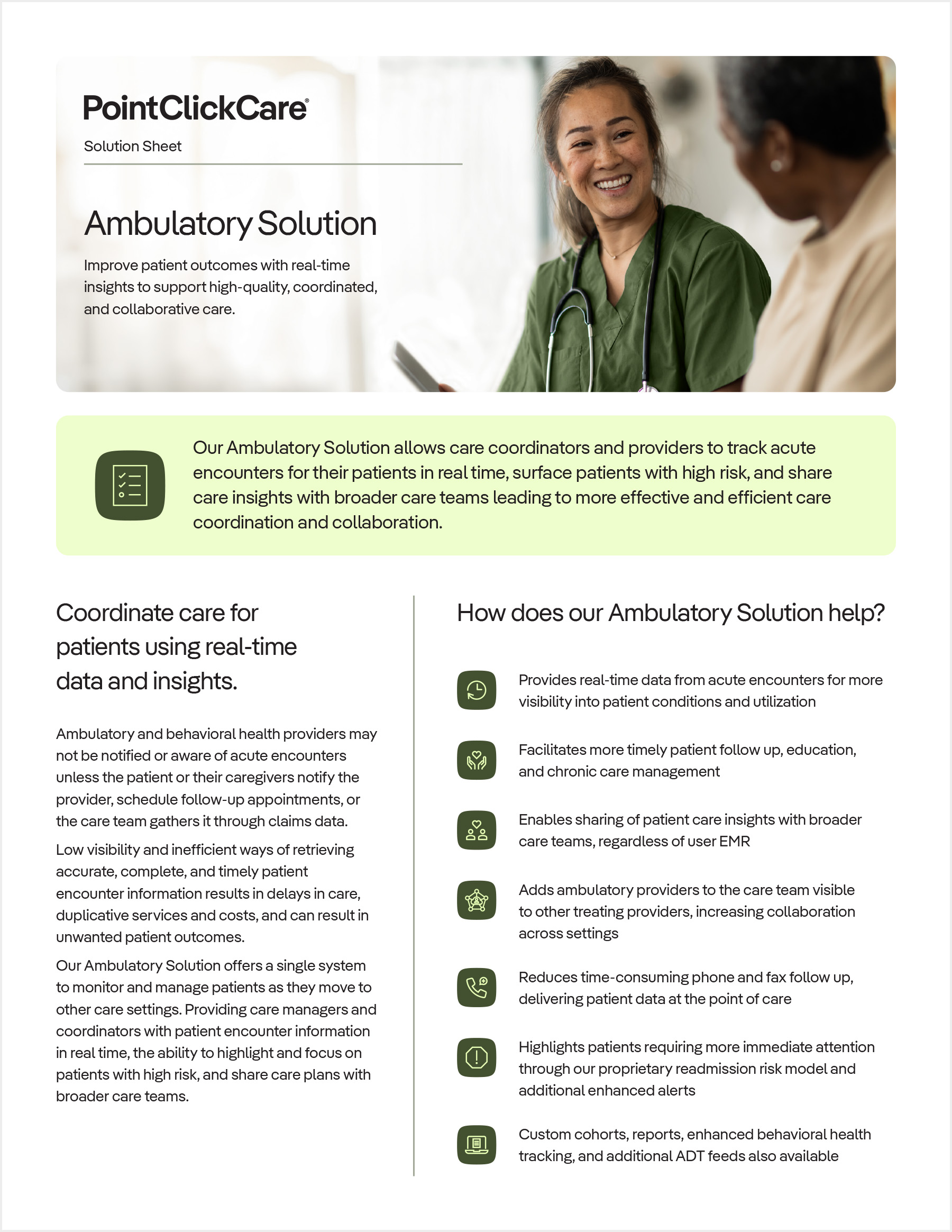 Our Ambulatory solutions enable care coordinators and providers to monitor acute patient encounters in real time, identify patients with high risk, and share care insights with the broader care teams, resulting in improved care coordination and collaboration.
