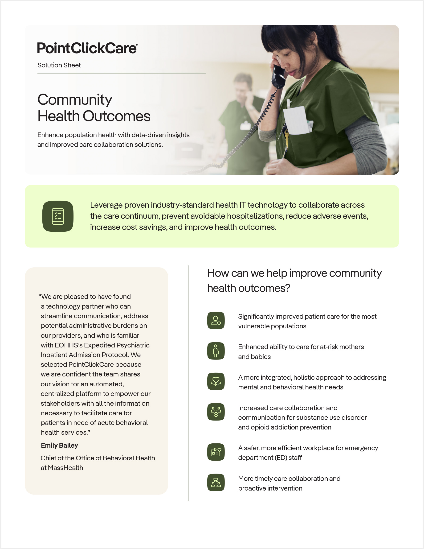 Resources Hospitals/Health Systems Community Health Outcomes Solution Sheet Solution Sheet:Community Health Outcomes Address community healthcare priorities, including health equity, maternal health, behavioral health, and substance use disorders, with best-in-class technology that empowers collaboration across the care continuum with real-time insights. View PDF