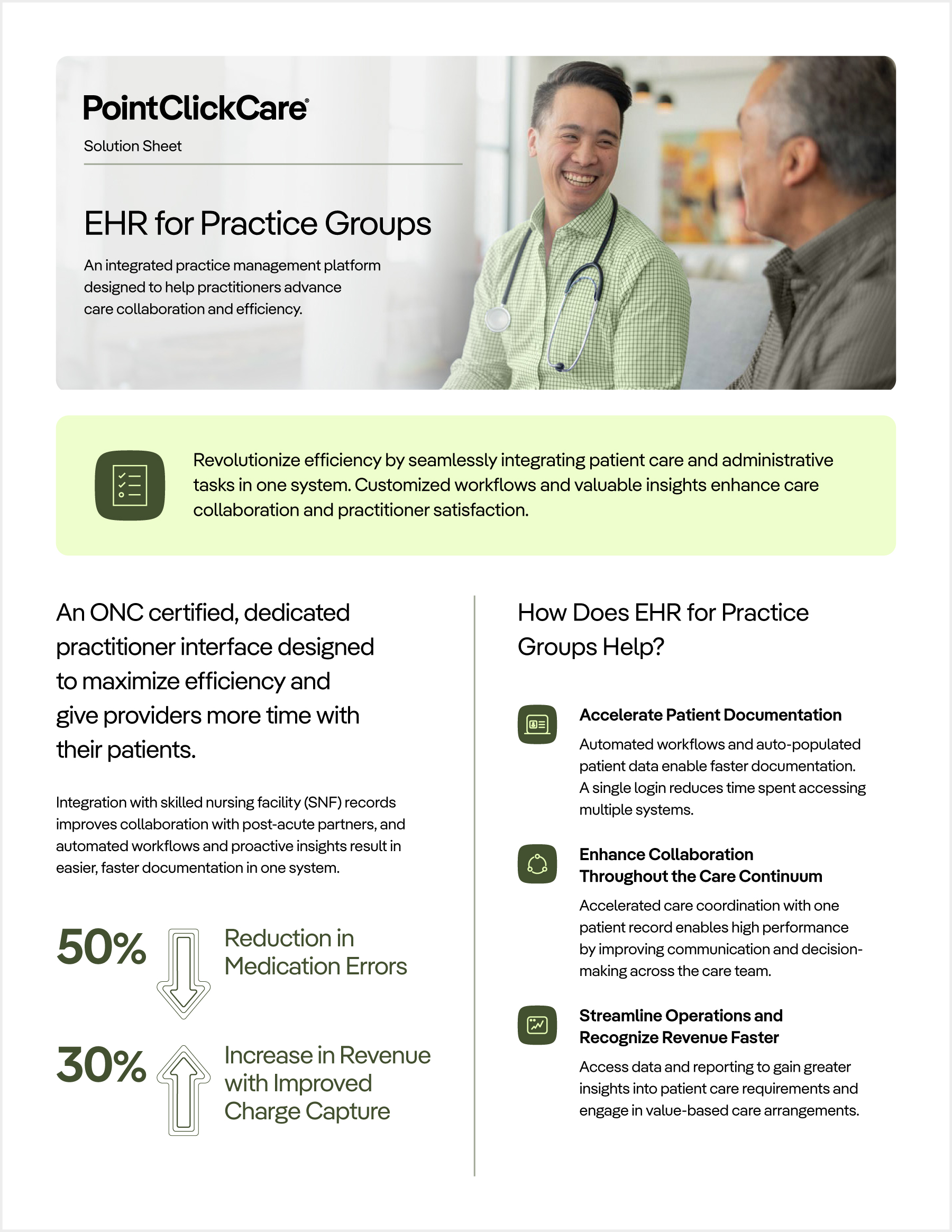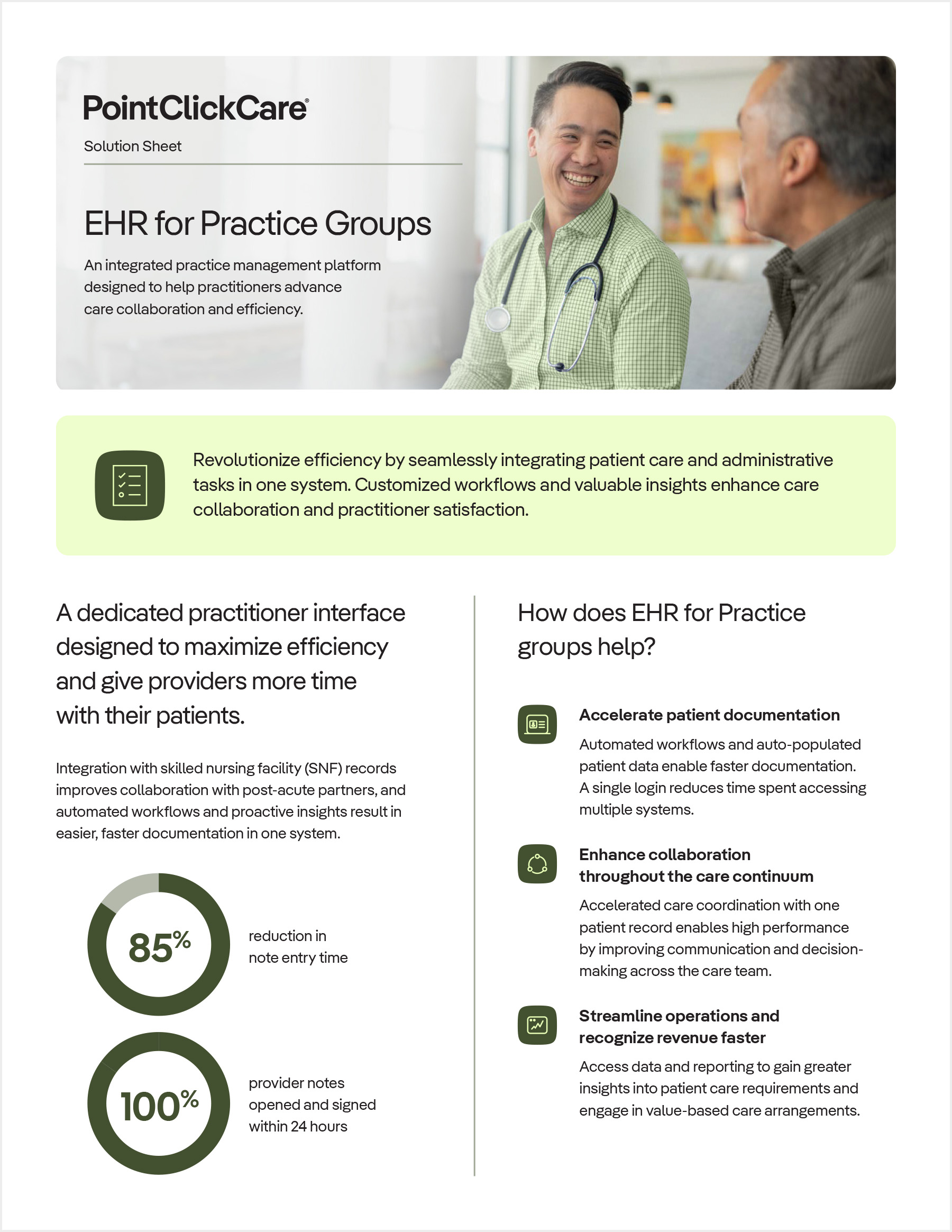 Discover how PointClickCare’s EHR for Practice Groups, a dedicated practitioner interface designed to maximize efficiency and give providers more time with their patients, can help you accelerate patient documentation, enhance care collaboration, streamline operations, and recognize revenue faster.