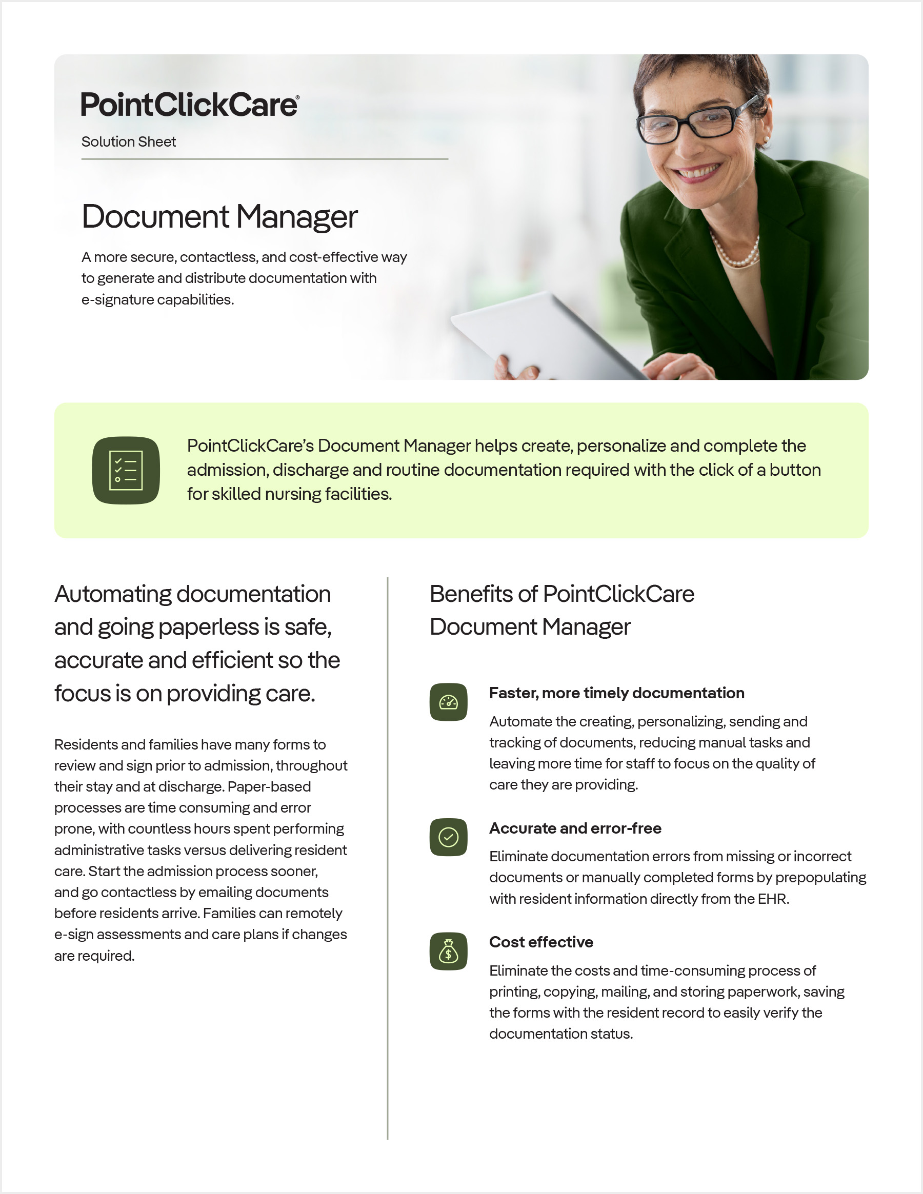 Residents and families have many forms to review and sign prior to admission, throughout their stay and at discharge. Paper-based processes are time consuming and error prone, with countless hours spent performing administrative tasks versus delivering resident care. Start the admission process sooner and go contactless by emailing documents before residents arrive.