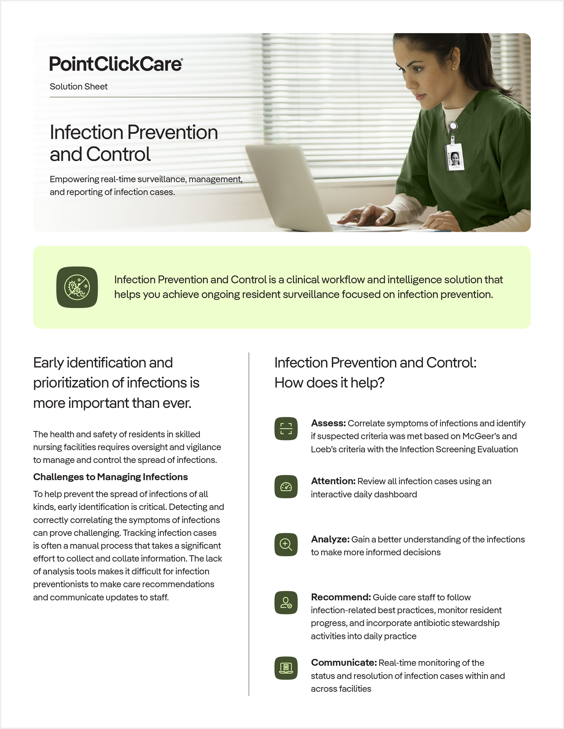 Infection Prevention and Control is a clinical workflow and intelligence solution that helps you achieve ongoing resident surveillance focused on infection prevention.