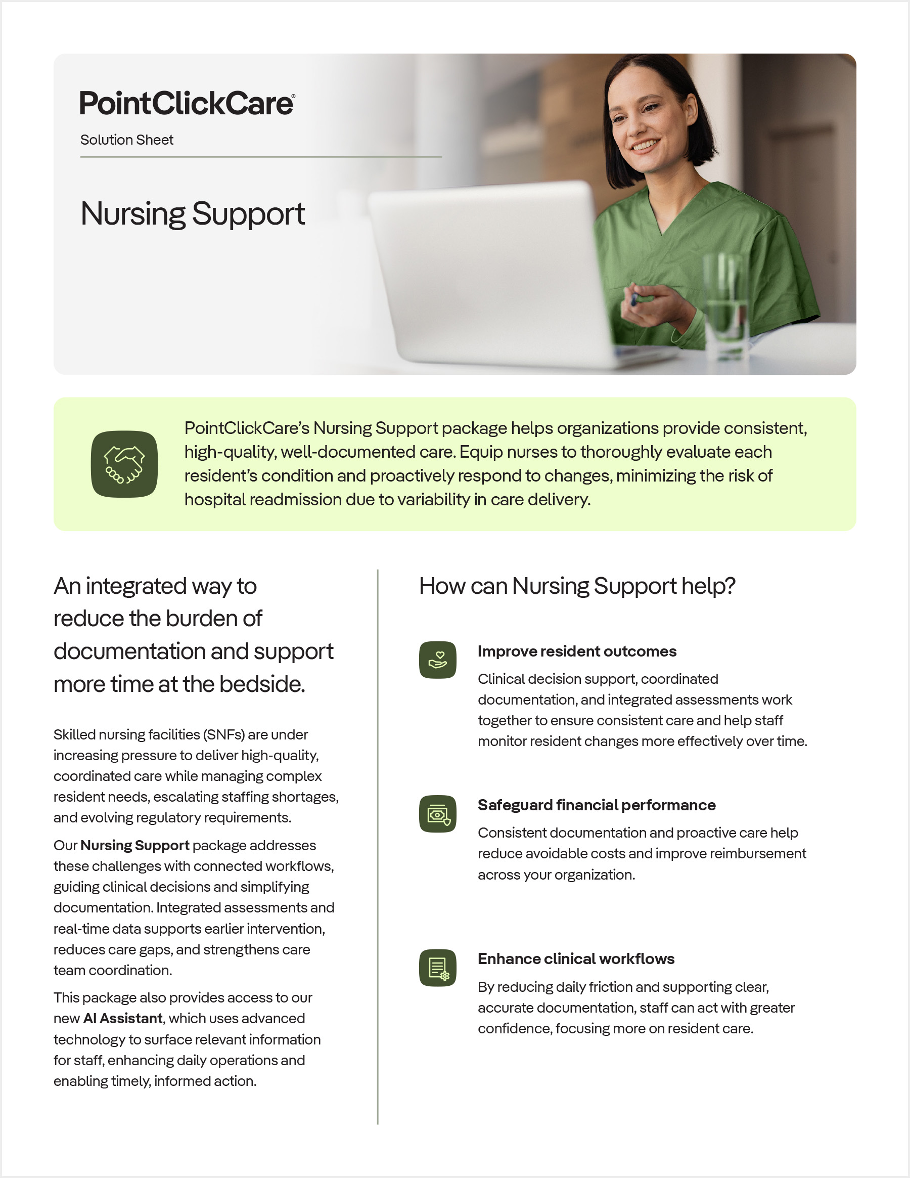 PointClickCare’s Nursing Support package helps organizations provide consistent, high-quality, well-documented care. Support nurses in thoroughly evaluating each resident’s condition and proactively responding to changes, minimizing the risk of hospital readmission due to variability in care delivery.